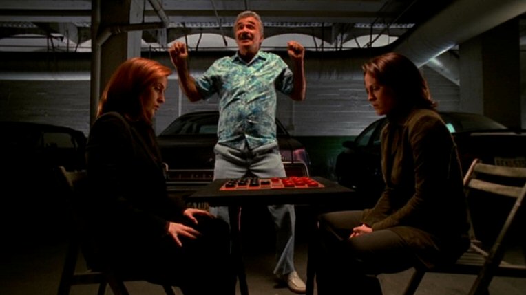 Maurício: Improvável é o título adequado para um episódio que tinha tudo para implodir. Foi feito no meio da nona e última temporada, quando a série estava nos seus estertores. O contrato com David Duchovny havia terminado na temporada anterior – ele retornaria apenas para o último episódio, The Truth. As participações de Gillian Anderson eram esporádicas. Os novos agentes da divisão Arquivo X do FBI, Monica Reyes (Annabeth Gish) e John Doggett (Robert Patrick), tinham jeito de pálidas cópias da dupla original (e eram). Todos os grandes arcos narrativos da série já haviam sido resolvidos. A nova trama com supersoldados ultrapassava os limites da suspensão de descrença. Por muito tempo, nem mesmo se sabia se o criador da série, Chris Carter, estaria envolvido nessa temporada. Esse esgotamento de ideias, que já vinha do oitavo ano, ficou evidente também nos episódios isolados. Empenhados em consolidar os novos personagens, os produtores exageraram ao imprimir um tom sombrio para os enredos. É nesse ponto desolador que entra Burt Reynolds.