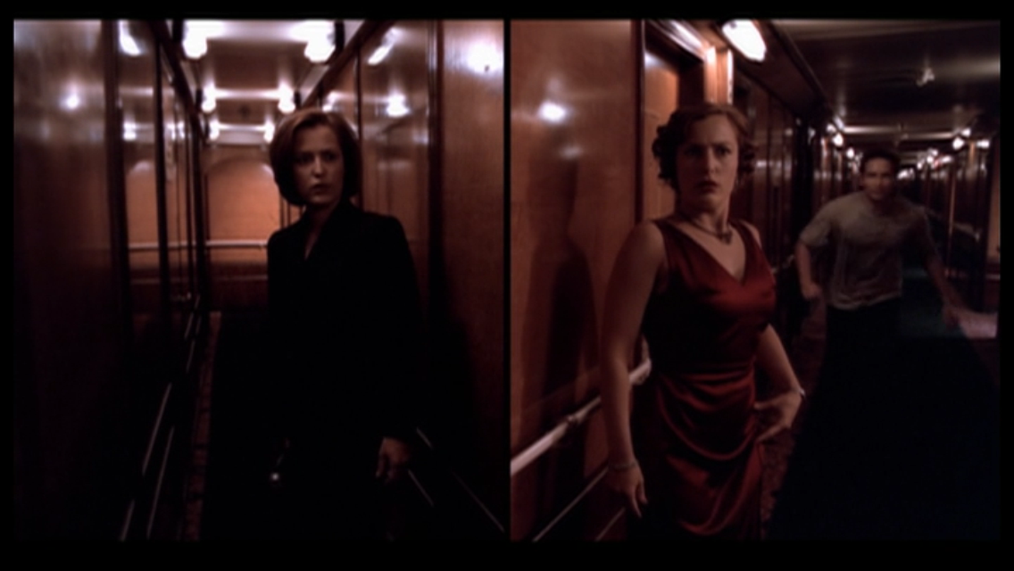A ideia é a seguinte: cada bloco do episódio é mostrado como uma tomada única, sem cortes. Na prática, Chris Carter utiliza a mesma trapaça que Alfred Hitchcock aplicou em Festim Diabólico (Rope, 1948) disfarçando seus cortes e editando os pedaços de maneira a simular a tomada contínua. De lambuja, temos ainda telas divididas no penúltimo segmento, as quais mostram a ação se desenrolando simultaneamente no passado (com Mulder) e no presente (com Scully), inclusive no mesmo espaço, a bordo do Queen Anne. Ah! Como se tudo isso não bastasse, Triangle foi ainda filmado em widescreen (2:35:1, ou seja, como um filme mesmo), e exibido originalmente em formato letterbox (1:33:1, aquele com as faixas pretas em cima e abaixo da imagem, que fica no centro da tela como se no cinema). Assim, buscava-se preservar a sensação dos planos contínuos e ressaltar a atmosfera de filme clássico da brincadeira.