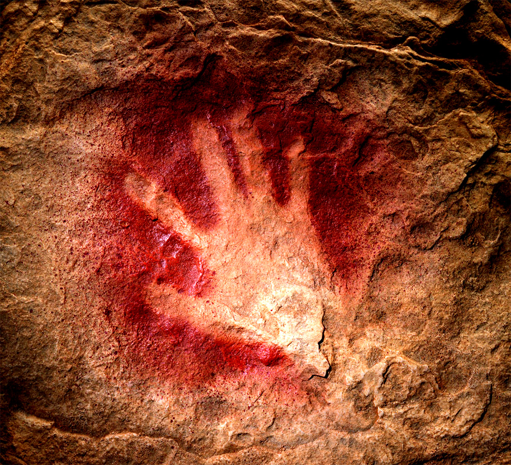 O que nos leva à segunda, e mais pessoal, representação de figuras humanas encontrada na Chauvet Pont d’Arc. Próximo ao que foi determinado como a entrada original da caverna, eventualmente lacrada por um deslizamento de terra, há um enorme painel repleto de pontos rubros. Na verdade, estas manchas são impressões de mãos feitas com tinta vermelha, semelhantes às que nós mesmos costumávamos pintar no jardim de infância. O detalhe mais importante destas impressões, que voltam a aparecer esporadicamente e com menor intensidade em outros pontos do local, é o fato de que um de seus autores possuía uma deformidade no dedo mindinho, provavelmente decorrente de uma fratura com calcificação inadequada. Como resultado, um indivíduo em particular pode ser identificado dentre todos os que passaram pelo local.
