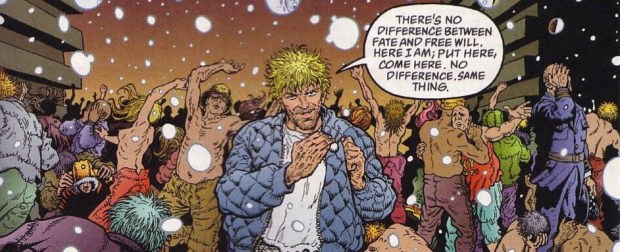 “Não há diferença entre destino e livre arbítrio”, em trecho do monólogo final da série. Arte de Frank Quitely.