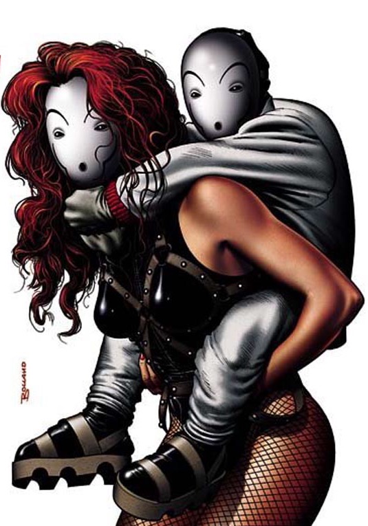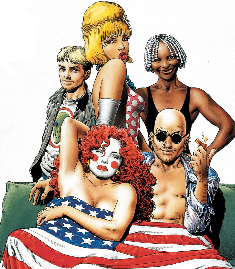 Da esquerda para a direita: Jack Frost, Lord Fanny, Boy (de pé), Ragged Robin e King Mob (sentados). Arte de Brian Bolland.