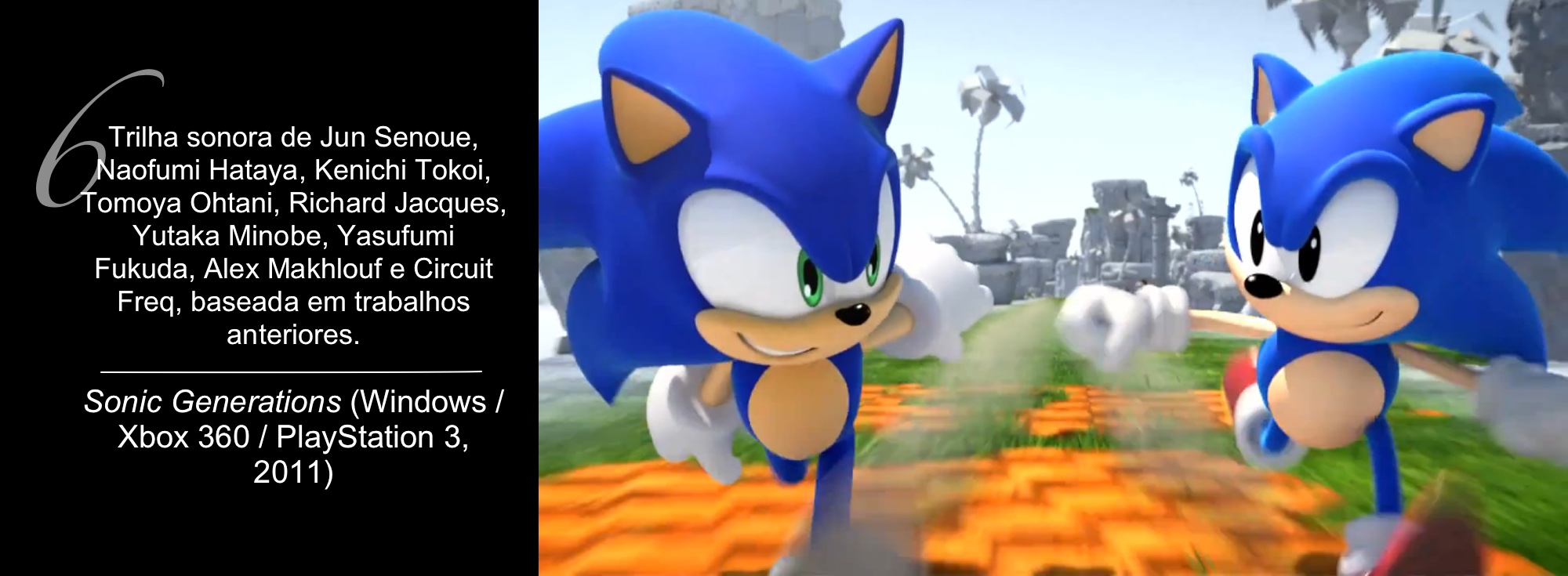 De nossa faixa de apelo mais popular para nosso peixe (ou ouriço) mais difícil de vender. Até o momento, nossa seleção tratou de óperas, orquestras, vozes e violões, procurando ilustrar o escopo do que os videogames são capazes de apresentar em termos musicais. Entretanto, estaríamos sendo omissos se não destacássemos, ao menos uma vez, os encantos da game music tradicional, de pegada eletrônica. Sonic Generations nos fornece a oportunidade perfeita para sanarmos essa ausência.