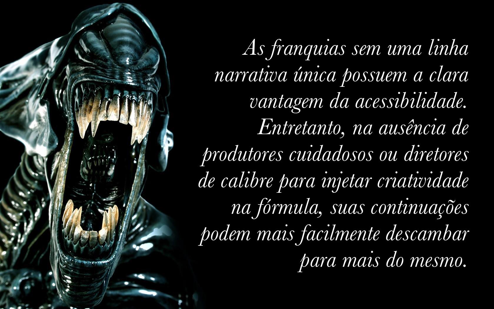 Tiago: Por outro lado, o fato de uma franquia trabalhar seus enredos de uma maneira mais aberta, sem a obrigatoriedade de eventualmente encerrar um arco principal, não necessariamente se traduz em qualidade. Para cada Bond ou Zatoichi, encontraremos um Alien. Apesar dos filmes serem lembrados pela Tenente Ripley de Sigourney Weaver, a ideia da série é simples e não clama por vinculação a nenhum personagem ou trama maior: desde que humanos incautos esbarrem nas criaturas-título e terminem virando almoço dos bichos (com exceção da heroína de instinto de sobrevivência sobre-humano), a essência da franquia estará mantida. Depois de ótimos primeiros passos com Alien, o 8º Passageiro (Alien, 1979) e Aliens, o Resgate (Aliens, 1986), as rodas foram se soltando nas continuações seguintes até culminar no prólogo/reboot Prometheus (2012) — ironicamente, dirigido pelo cineasta que iniciou a série. No espaço, ninguém pode ouvi-lo perguntar que diabos aconteceu com Ridley Scott.