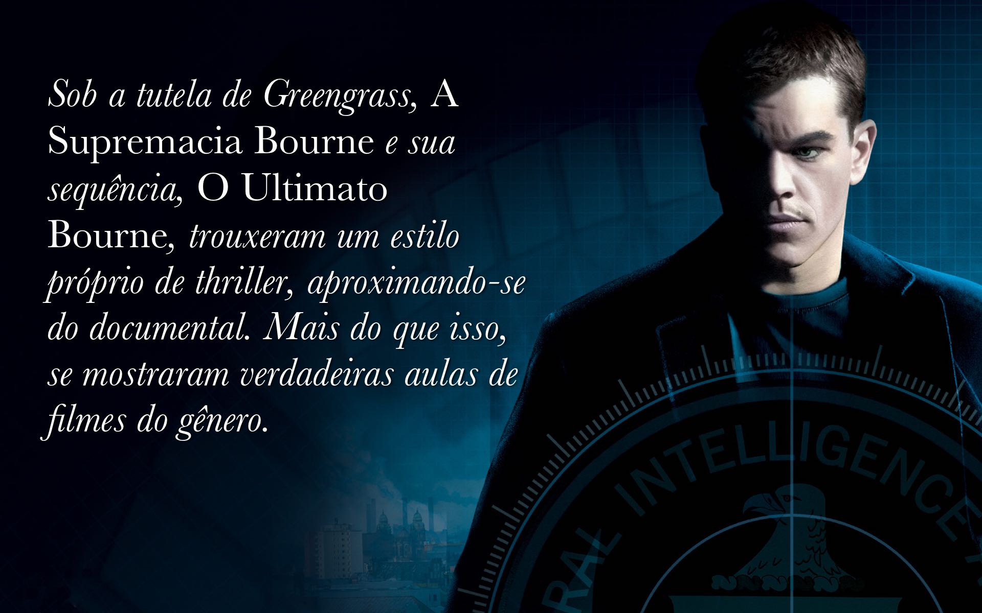 Sob a tutela de Greengrass, A Supremacia Bourne (The Bourne Supremacy, 2004) e sua sequência, O Ultimato Bourne (The Bourne Ultimatum, 2007), trouxeram um estilo próprio de thriller, aproximando-se do documental. Mais do que isso, se mostraram verdadeiras aulas de filmes do gênero. A câmera trêmula seguindo o protagonista de perto transporta o espectador para o centro da ação, envolvendo-o sem o artifício da projeção em 3D. O ritmo é alucinante, com longas cenas de tensão e momentos mais quietos durando apenas o suficiente para nos permitir recuperar o fôlego. O uso mínimo de computação gráfica e as perseguições de carros empolgantes nos remete a clássicos do cinema policial como Operação França (The French Connection, 1971) e Ronin (1998). Por fim, mas não menos importante, encontramos um Matt Damon convincente e seguro no papel de um homem em busca de suas lembranças perdidas (e, a partir do segundo filme, vingança), elemento ausente no início da série. Não foi à toa que Bond teve que correr atrás do prejuízo.